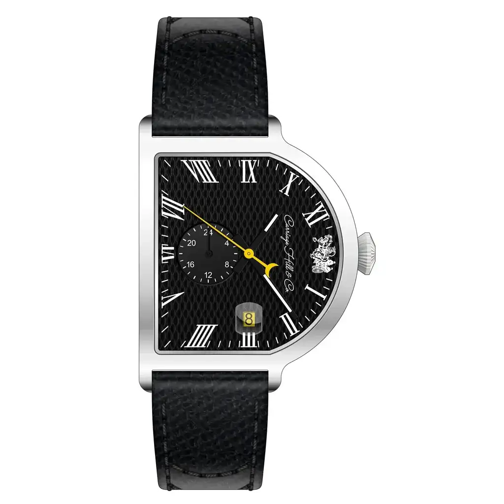The Black Observateur is a study in elegant contrast. A polished silver-tone case frames a textured black dial, detailed with crisp Roman numerals, a small seconds subdial, and a yellow seconds hand for a contemporary edge. Completed with a black calfskin leather strap and powered by a Japanese quartz movement, it’s a bold signature piece for the modern gentleman.