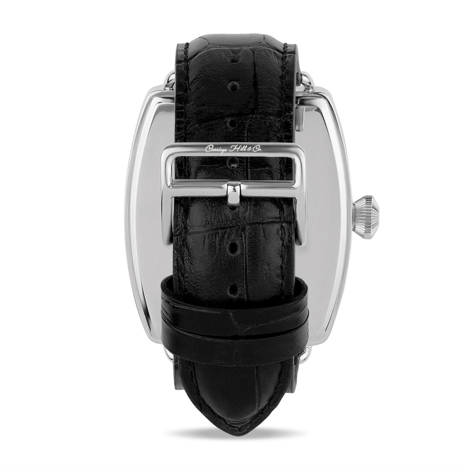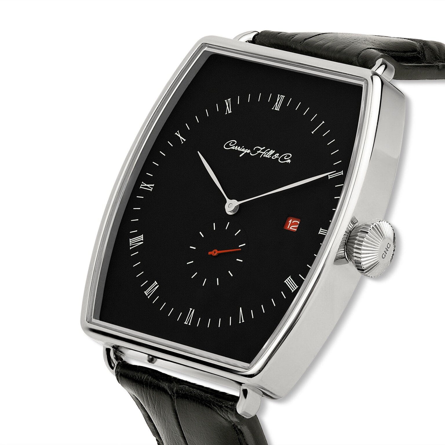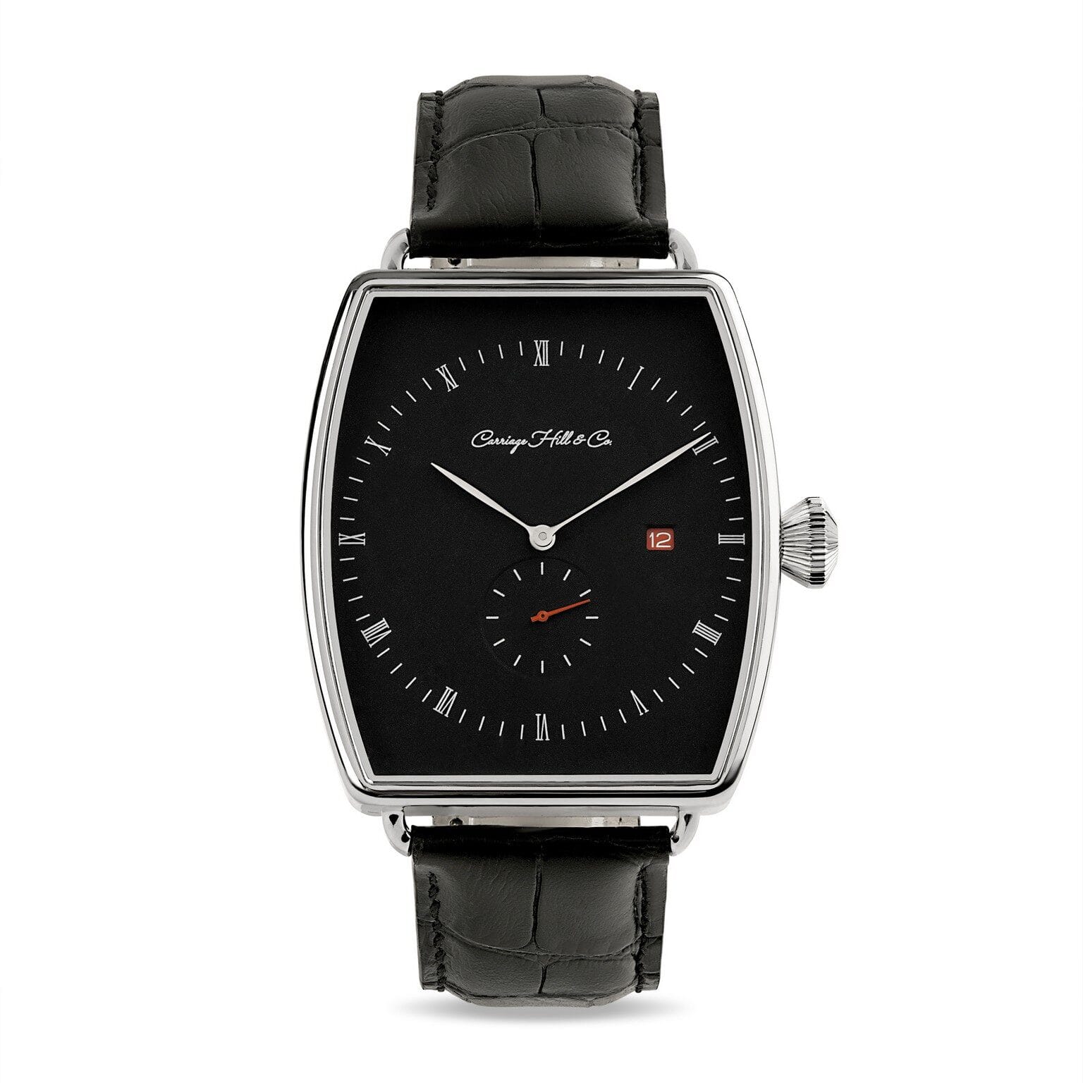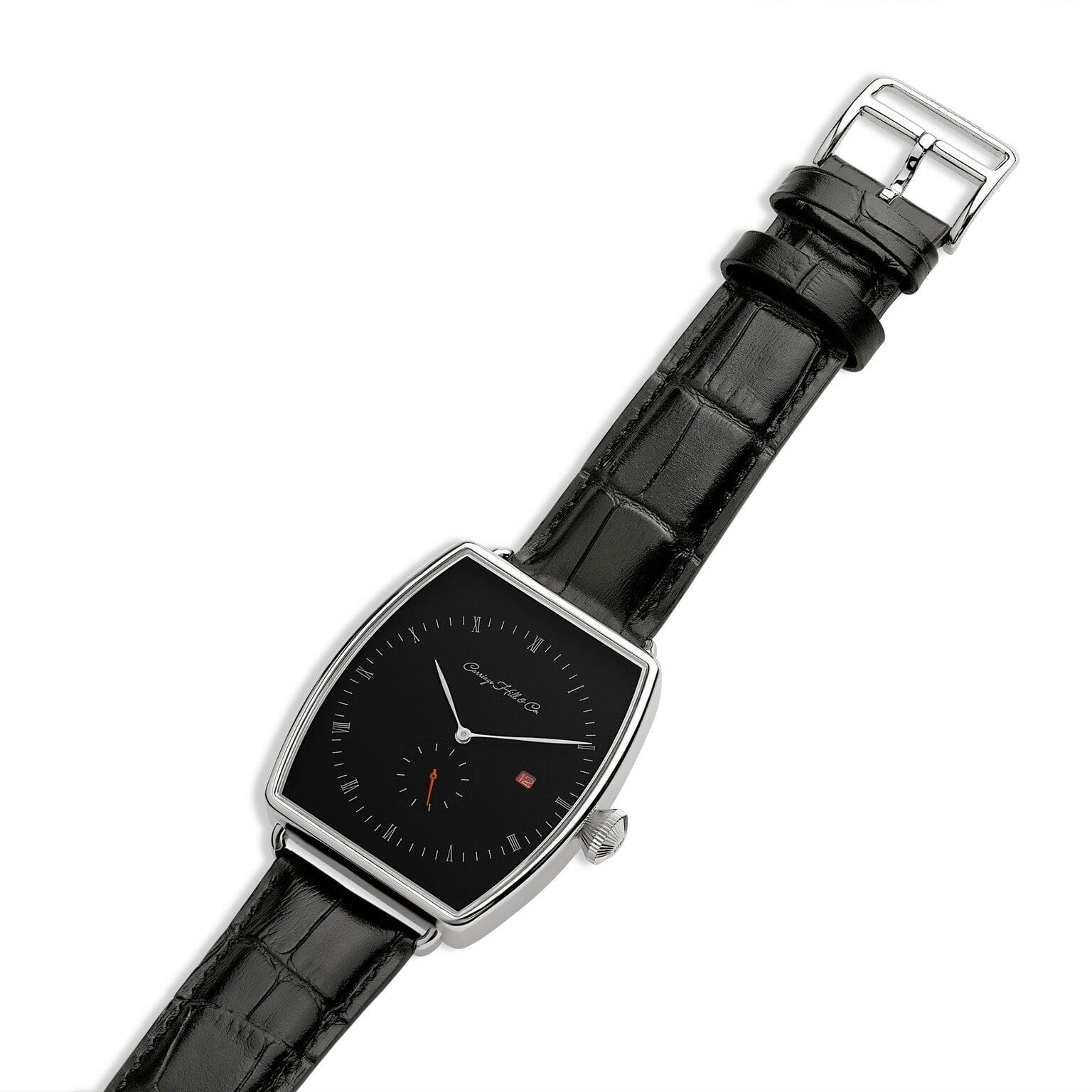 The Heritage Black is where sharp design meets quiet confidence. A deep black dial with Roman numerals is encased in polished silver, accentuated by a red-accented date window and a small seconds subdial at 6 o’clock. Paired with a black calfskin leather strap and protected by a sapphire crystal, this quartz-powered watch delivers enduring style and everyday refinement.