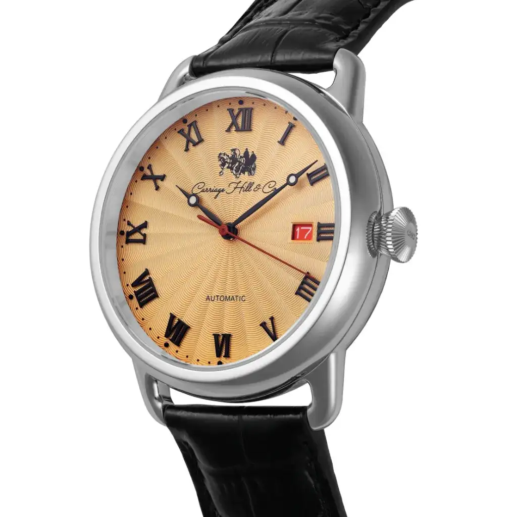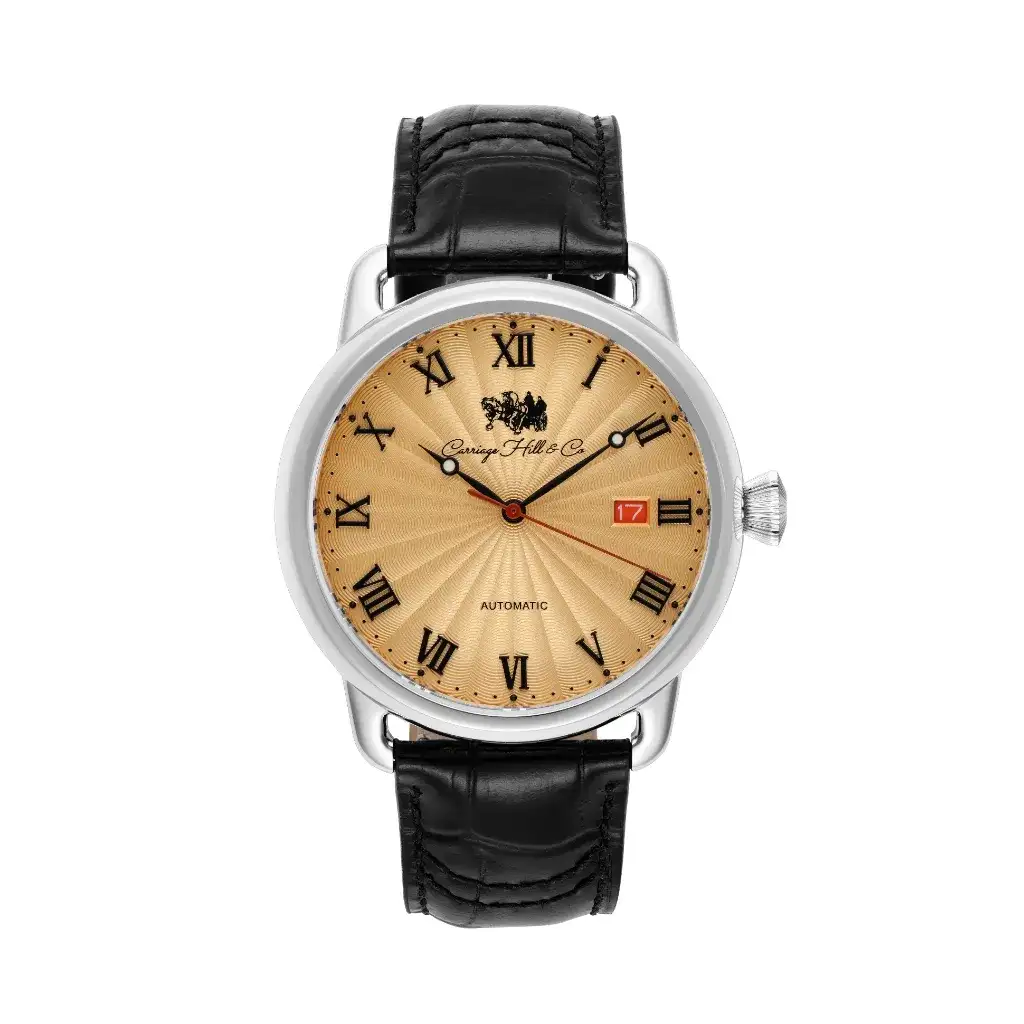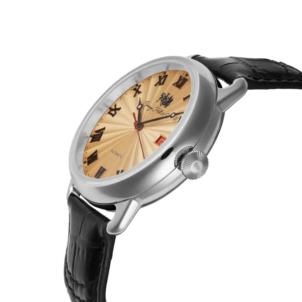 The Honorable Brown is a study in understated opulence. Its radiant gold-tone dial, etched with a subtle spiral motif, is framed by bold Roman numerals and finished with a rich black leather strap. A polished silver case houses the automatic movement beneath sapphire crystal glass. With a red-accented date window and classic silhouette, it’s made for those who prefer quiet elegance.